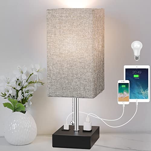 Equipped with a USB port and AC outlet, you can conveniently charge your phone or plug in any other electronic device without having to search around for an outlet. It also includes a grey shade that beautifully diffuses the light, creating a soft and pleasing glow.